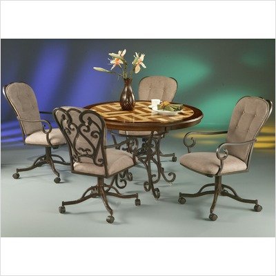 VD 510 AR / 478-Tabletop / MA-160-AR Features: -Set includes dining table and four chairs with casters. -Chair upholstered in Moccasin Suede fabric. -Table top construction: Wood. -Traditional style. -Round shaped Faux marble faux marble poly travertine insert top. -Caster chairs have heavy duty swivel tilt mechanism for long lasting durability. -Manufacturer provides one year warranty.