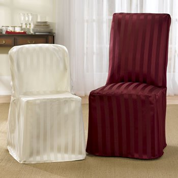 Company coming? These dining chair covers are a quick, affordable way to refresh worn-out furniture or add a soft, updated look. Made of woven polyester, the Tonal Stripe Slipcovers are simple to use: just tie them on to your dining or folding chairs. Each dining chair cover completely hides your chair, so worn-out upholstery or stains are not a problem. Use the Tonal Stripe Slipcovers to transform ordinary folding chairs into elegant seating. The Tonal Stripe Slipcovers are machine washable. Imported. When ordering Tonal Stripe Chair Slipcovers, please specify cream, deep rose, burgundy, or gold.Benefits of the Tonal Stripe Chair Slipcovers:Redecorate in minutes with Tonal Stripe Chair Slipcovers Folding Chair Cover features ties on the inside; Dining Chair Cover has ties on the back The Tonal Stripe Chair Slipcovers come in a variety of colors: change the look for each season!